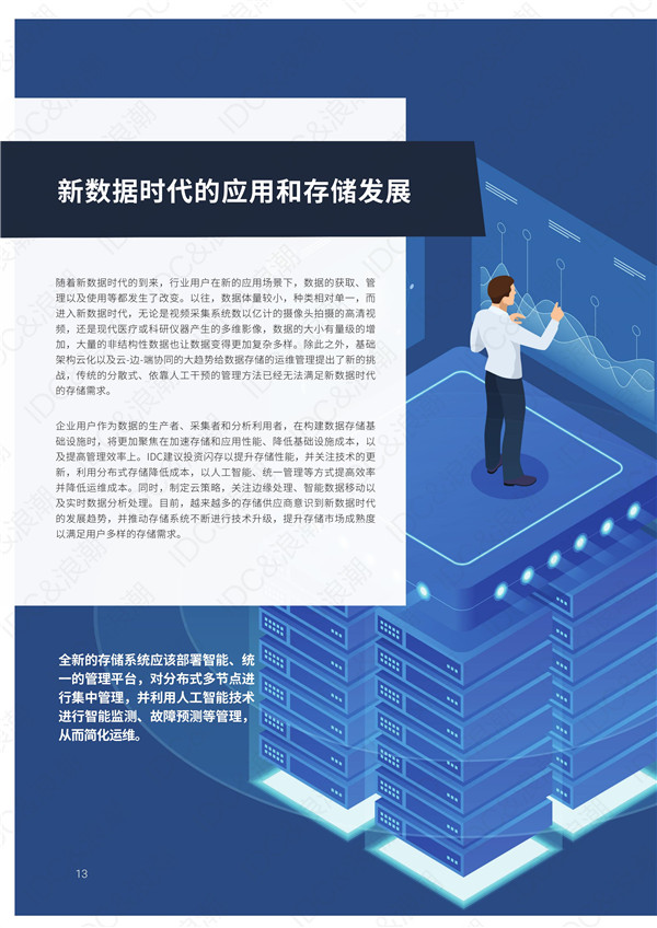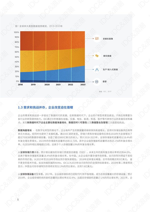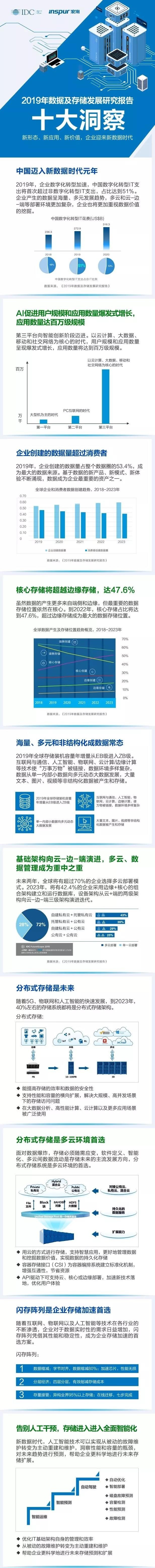 報告顯示,在2019年中國數(shù)字化轉(zhuǎn)型IT支出首次超過非數(shù)字化轉(zhuǎn)型IT支出,占比達(dá)到51%。隨著數(shù)字化轉(zhuǎn)型的不斷加速,行業(yè)新應(yīng)用從數(shù)千、數(shù)萬躍升到百萬量級,數(shù)據(jù)呈現(xiàn)出海量、多元、實時、多云等趨勢。數(shù)據(jù)存儲成為承載產(chǎn)業(yè)轉(zhuǎn)型的基礎(chǔ)平臺,分布式存儲成為趨勢,2023年其占比將達(dá)到40%,閃存陣列將迎來高速發(fā)展。