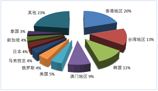 第三季度旅行社入境旅游接待人次排名前十位的客源地國家或地區(qū)由高到低依次為香港地區(qū)、臺灣地區(qū)、韓國、澳門地區(qū)、美國、俄羅斯、馬來西亞、日本、新加坡、泰國(見圖2)。