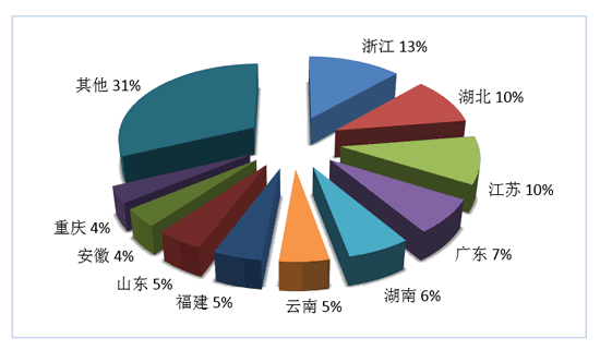 第三季度旅行社國內(nèi)旅游接待人次排名前十位的地區(qū)由高到低依次為浙江、湖北、江蘇、廣東、湖南、云南、福建、山東、安徽、重慶(見圖4)。