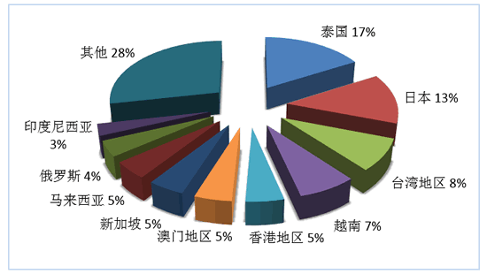 第三季度旅行社出境旅游組織人次排名前十位的目的地國家或地區(qū)由高到低依次為泰國、日本、臺灣地區(qū)、越南、香港地區(qū)、澳門地區(qū)、新加坡、馬來西亞、俄羅斯、印度尼西亞(見圖5)。