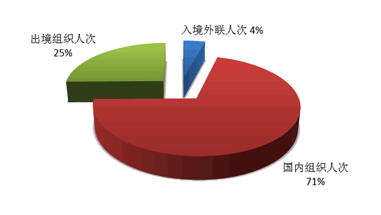 按照入境外聯(lián)人次、國內(nèi)組織人次、出境組織人次三項(xiàng)指標(biāo),入境旅游、國內(nèi)旅游、出境旅游市場人次所占份額依次為4%、71%和25%(見圖6)。
