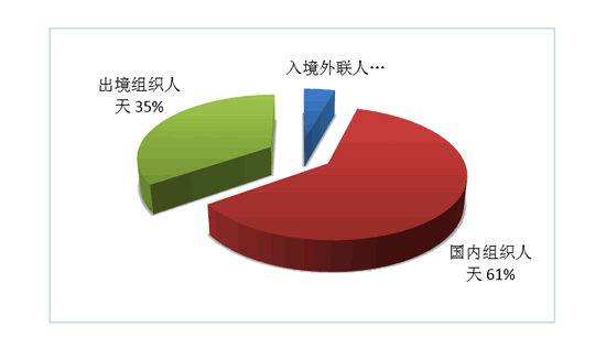 按照入境外聯(lián)人天、國內(nèi)組織人天、出境組織人天三項(xiàng)指標(biāo),入境旅游、國內(nèi)旅游、出境旅游市場人天所占份額依次為4%、61%、35%(見圖7)。